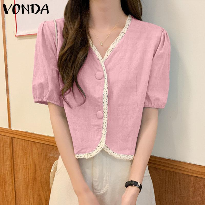 VONDA женская летняя свободная рубашка с v-образным вырезом и короткими рукавами, кружевная лоскутная однотонная рубашка на пуговицах