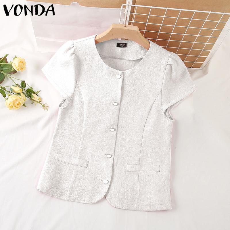 VONDA женский летний круглый вырез с буфами и коротким рукавом, прямой однобортный однотонный свободный маленький ароматный стильный блейзер