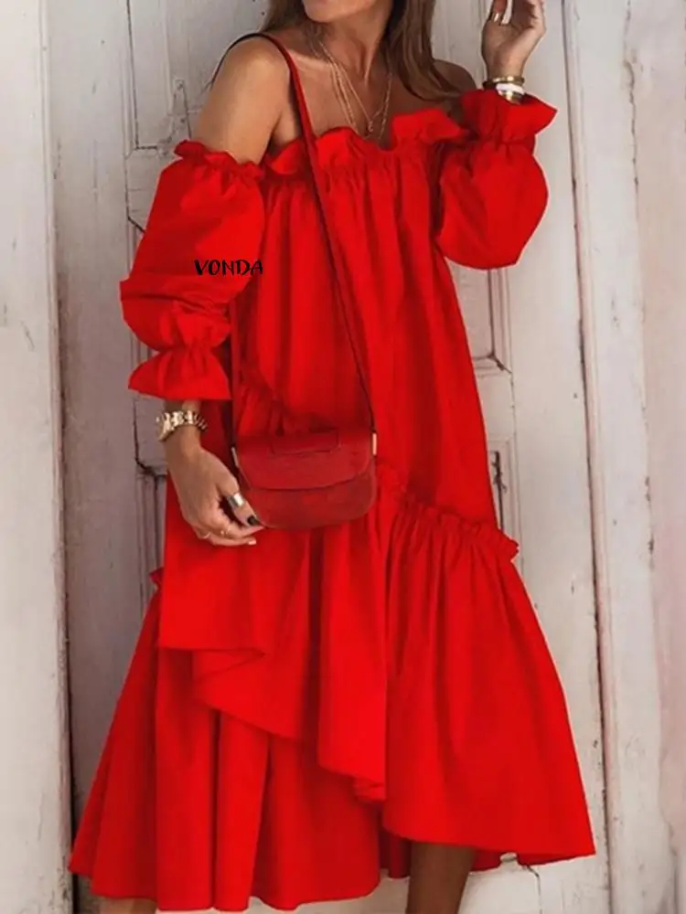 VONDA женское богемное платье большого размера с открытыми плечами Плиссированное асимметричное вечерние нее платье с длинным рукавом сексу...