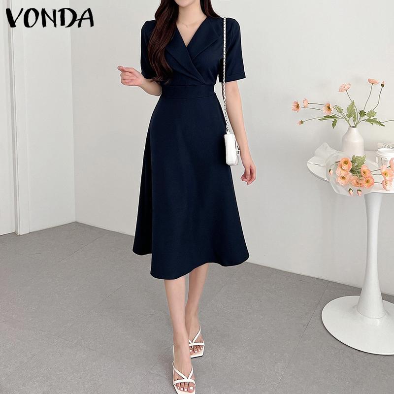 VONDA женское летнее однотонное длинное платье трапециевидной формы с короткими рукавами и лацканами