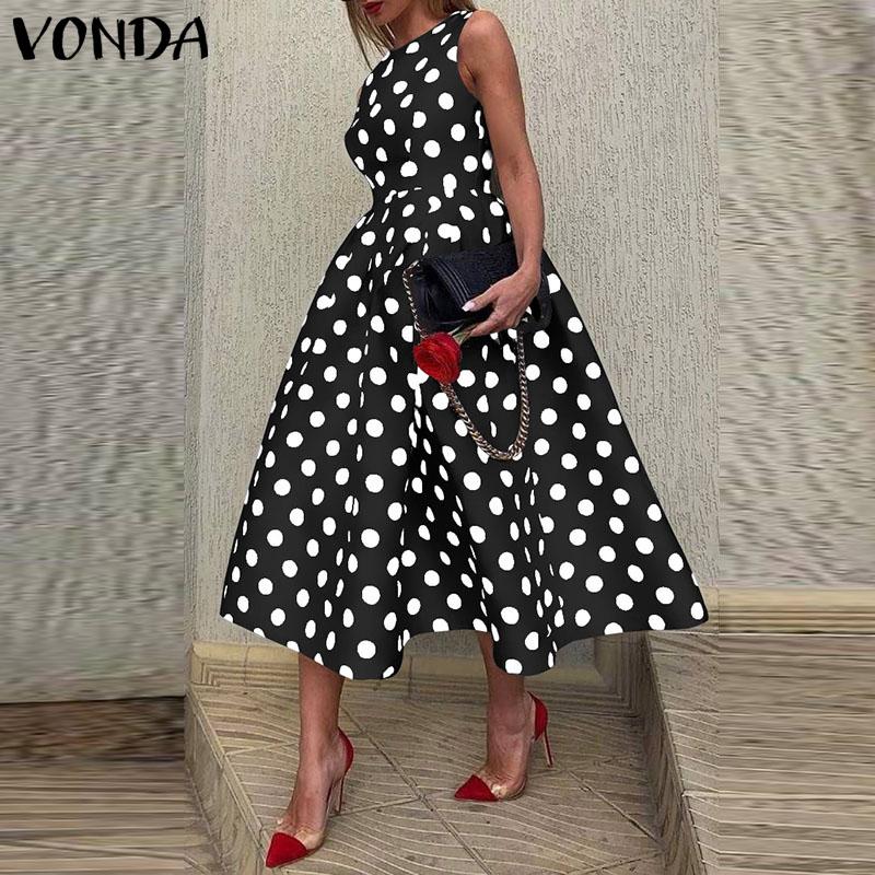 VONDA женское летнее свободное длинное платье А-типа в горошек с круглым вырезом и без рукавов 3XL зелёный