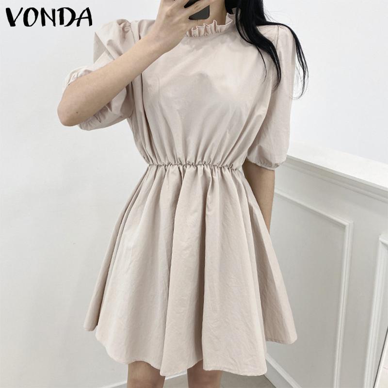 VONDA S-5XL летние женские повседневные однотонные короткие платья с рукавами-фонариками модные праздничные плиссированные мини-платья-туники