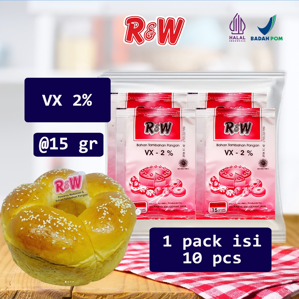 VX 2% Rajawali R&W RW digunakan untuk mengembangkan adonan segala roti, kue kering, kue basah, atau segala bahan pengempuk, dll.