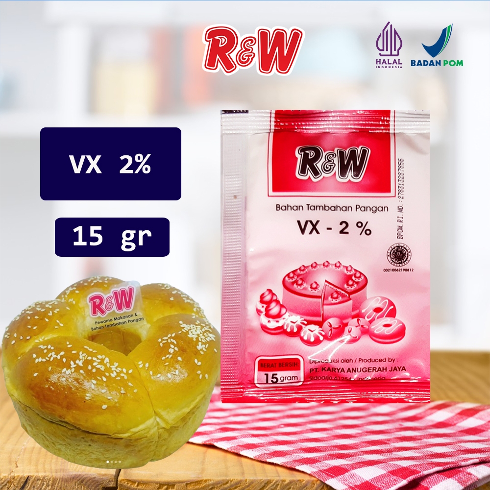 VX 2% Rajawali R&W RW digunakan untuk mengembangkan adonan segala roti, kue kering, kue basah, atau segala bahan pengempuk, dll.