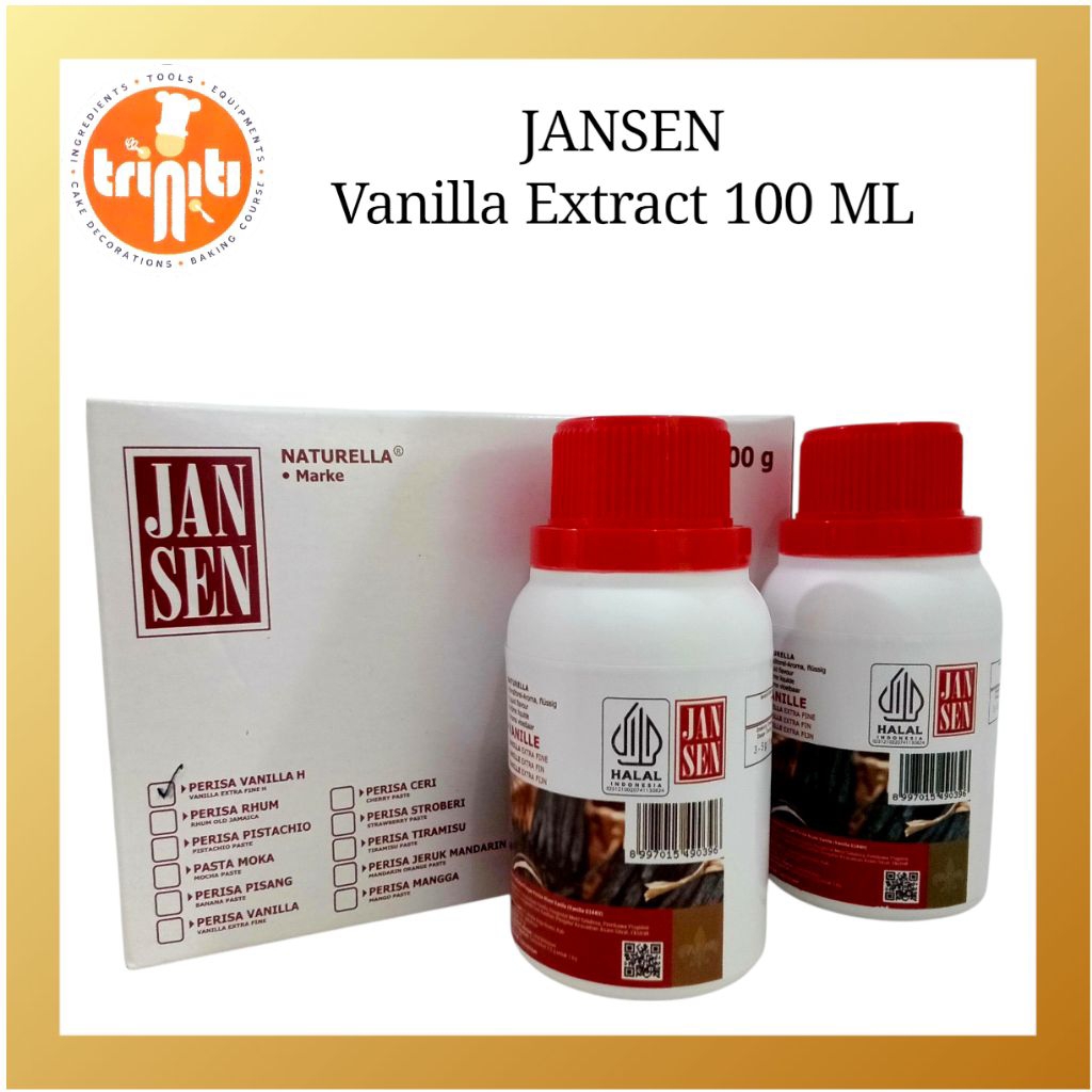 Jansen Vanilla Extrak merupakan salah satu bentuk olahan yang sangat mudah digunakan dengan tekstur yang agak kental, berwarna coklat dan aroma vanilla yang kuat dan khas. di pergunakan untuk kebutuhan pembuatan kue, dessert, es krim, bahan minuman, dll
