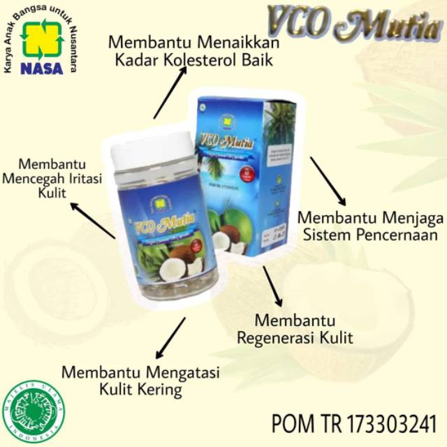 VCO Mutia atau Virgin Coconut Oil merupakan produk kesehatan berupa minyak kelapa murni dalam bentuk kapsul yang mempunyai banyak manfaat untuk kesehatan tubuh dan kecantikan kulit.