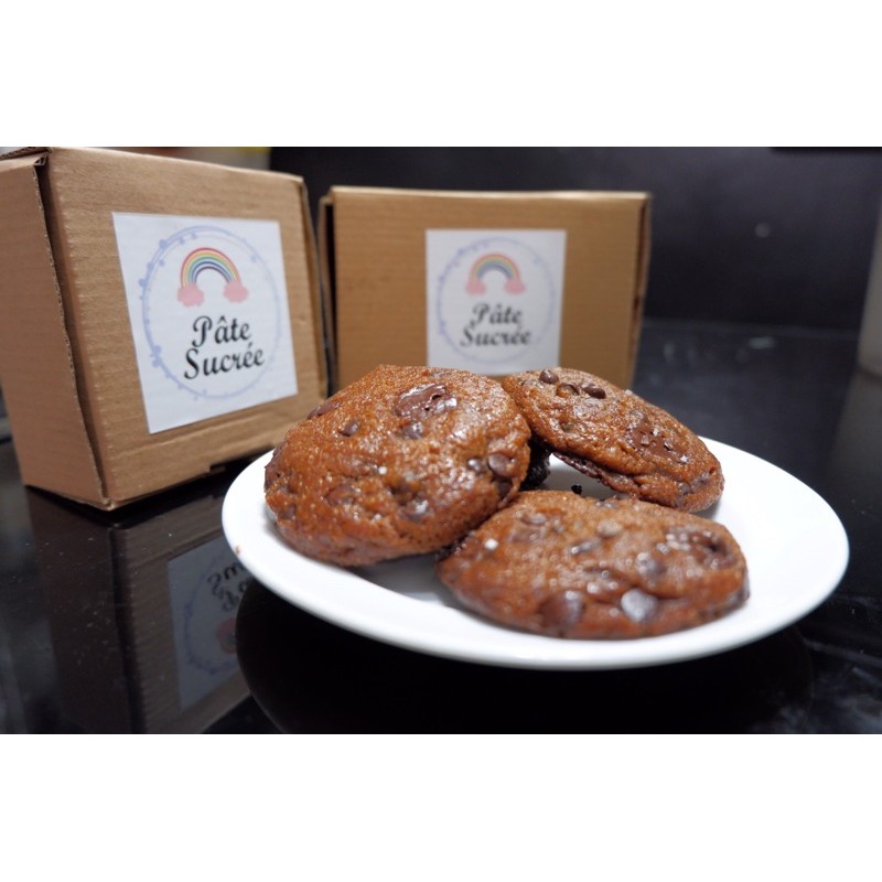 Let me introduce you to our vegan chocolate chip cookies. Soft cookie dough with lots of dark chocolate chips and top with pinch of sea salt. No dairy and eggs. It’s a perfect cookies for those of you who vegan or have an allergy to dairy or eggs.