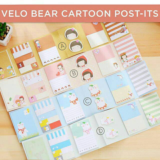 Koleksi catatan tempel (post-it) dalam berbagai bentuk dan ukuran. Setiap lembarnya berhiaskan warna terang dan ilustrasi gadis kecil dan beruang kutub yang lucu.