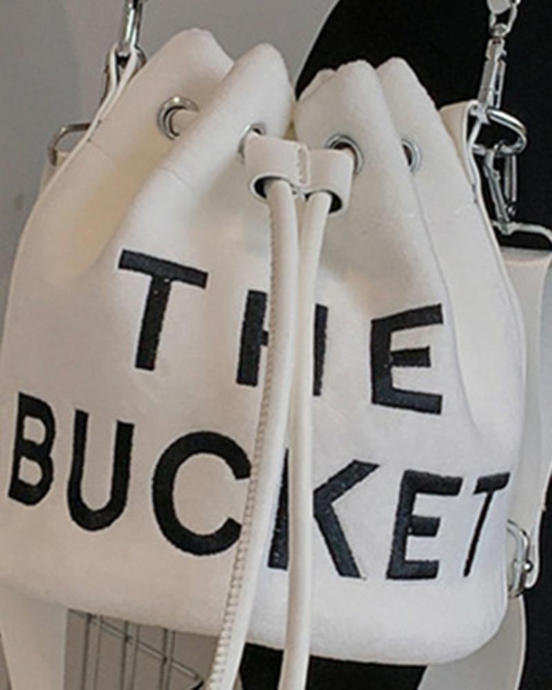 Velvet Letter Pattern Drawstring Bucket Bag, White