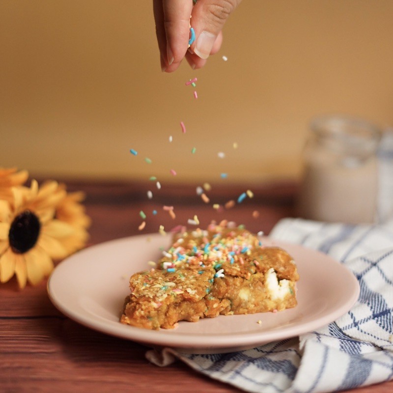 1/6 pan of funfetti dough with white choco chunks and cream cheese