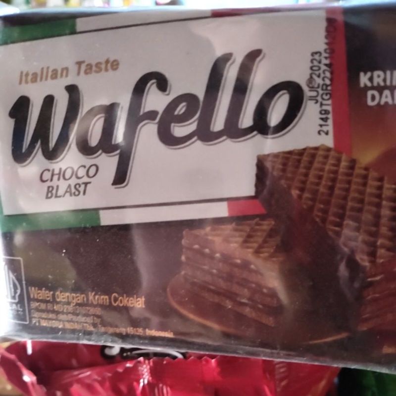 Wafer Wafello dengan wafer yg renyah dan krim coklat yang lezat.