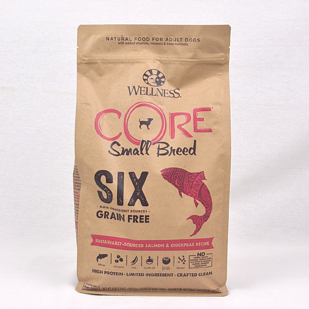 DescriptionGive your small sidekick a meal that’s going to fuel her day by serving up abowlful of Wellness CORE SIX Dry Dog Food! This scrumptious canine kibble iscrafted with real salmon as the very first ingredient, followed by otherrecognizable ingredients including salmon meal, peas and chickpeas for thehigh-quality nutrition your best friend deserves. And it’s completely free ofgrains, chicken, potatoes, tapioca, dairy, soy and wheat, which means it’spaw-fect for sensitive pups. Wellness’ CORE SIX contains just six mainingredients for the first-class, high-protein and balanced diet your dog needsto flourish from the core.Key Benefits * Made with non-GMO sourced ingredients because your paw-tner deserves the best. * Crafted with sustainably-sourced salmon and salmon meal, which deliver healthy omega fatty acids to encourage healthy skin and a lustrous coat. * High-protein recipe contains just 6 main ingredients. * 100% free of grains, wheat, soy, dairy, tapioca, potatoes and chicken. * Made without artificial flavors, colors, or preservatives for a kibble you can count on.IngredientsSalmon, Salmon Meal, Chickpeas, Peas, Pea Protein, Canola Oil (Preserved WithMixed Tocopherols), Tomato Pomace, Ground Flaxseed, Calcium Carbonate, NaturalFish Flavor, Vitamins (Vitamin E Supplement, Niacin, Vitamin A Supplement,Thiamine Mononitrate, D-Calcium Pantothenate, Pyridoxine Hydrochloride,Riboflavin, Biotin, Vitamin D3 Supplement, Vitamin B12 Supplement, Folic Acid,Ascorbic Acid [Vitamin C]), Choline Chloride, Minerals (Zinc Proteinate, ZincSulfate, Iron Proteinate, Ferrous Sulfate, Copper Sulfate, Copper Proteinate,Manganese Proteinate, Manganese Sulfate, Sodium Selenite, Calcium Iodate),Taurine, Mixed Tocopherols Added To Preserve Freshness, Dried LactobacillusPlantarum Fermentation Product, Dried Enterococcus Faecium Fermentation Product,Dried Lactobacillus Casei Fermentation Product, Dried Lactobacillus AcidophilusFermentation Product, Rosemary Extract, Green Tea Extract, Spearmint Extract.Guaranteed AnalysisCRUDE PROTEIN35.0% minCRUDE FAT16.0% minCRUDE FIBER6.0% maxMOISTURE10.0%maxCALCIUM1.60% minPHOSPHORUS1.20% minVITAMIN A25,000 IU/kg minVITAMIN E400IU/kg minOMEGA-6 FATTY ACIDS3.80% minOMEGA-3 FATTY ACIDS2.00% minGLUCOSAMINE250mg/kg minCHONDROITIN SULFATE200 mg/kg min