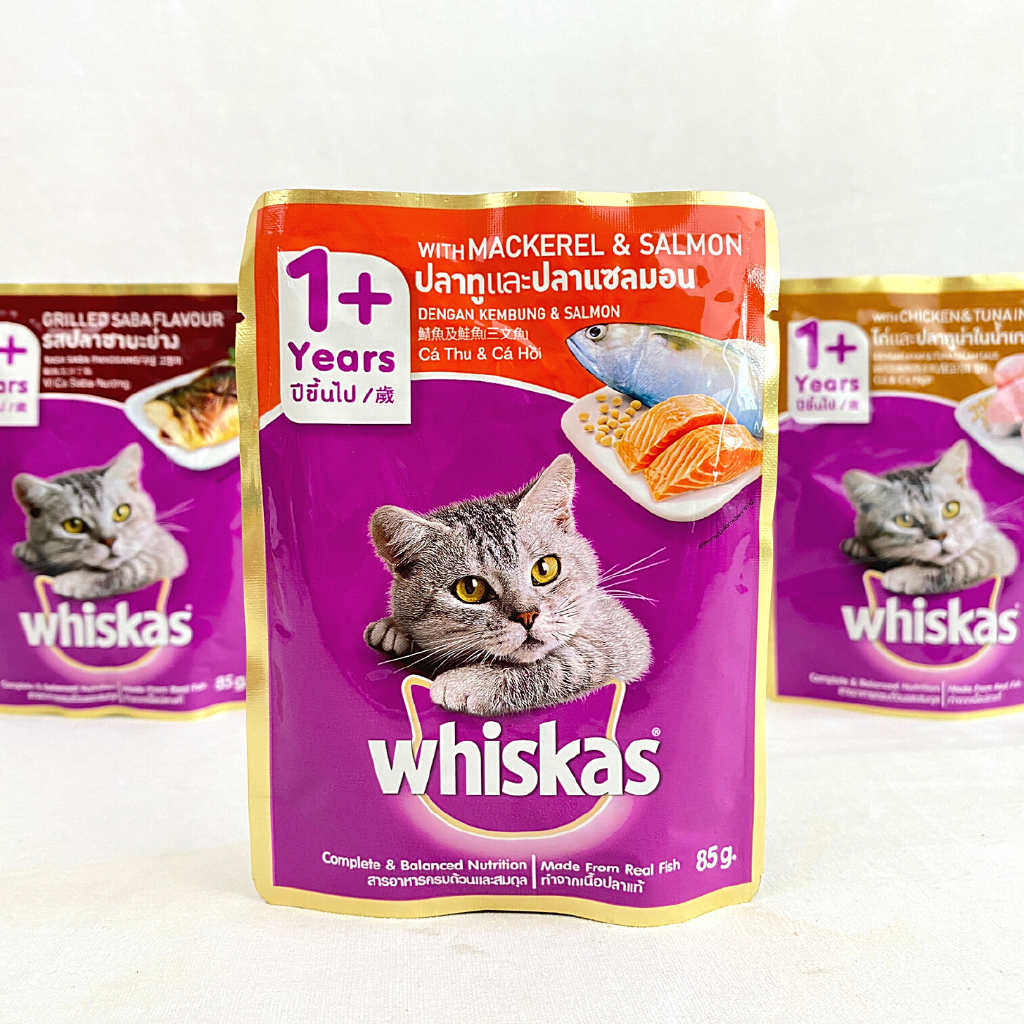 Whiskas® Pouch Adult 1+ Mackerel & SalmonKucing dengan usia 1-6 tahun membutuhkan banyak latihan dan bermain sertamakanan yang seimbang untuk menjaganya tetap aktif dan sehat. Kucing adalahkarnivora, sedangkan manusia , omnivora, jadi kucing membutuhkan 2 kali lebihbanyak protein daripada manusia. Mereka juga membutuhkan 41 kandungan nutrisiesensial untuk kesehatan yang optimum. WHISKAS mengerti akan kandungan nutrisiyang dibutuhkan oleh kucing dan setiap produk secara spesifik di formulasikandengan kandungan nutrisi yang lengkap dan seimbang.-Spesifik diformulasikan untuk kucing usia 1 tahun keatas-Mengandung Omega 3 & 6 , serta Zinc untuk kesehatan kulit dan bulu yang indah.-Mengandung Vit.A dan taurine untuk kesehatan matanya-Mengandung protein dari ikan yang segar, lemak yang baik, vitamin dan mineralyang seimbang, untuk tetap menjaga kucingmu aktif dan bahagia.-Mengandung Antioksidan (Vit E dan Selenium ) untuk kesehatan sistem immunnya.