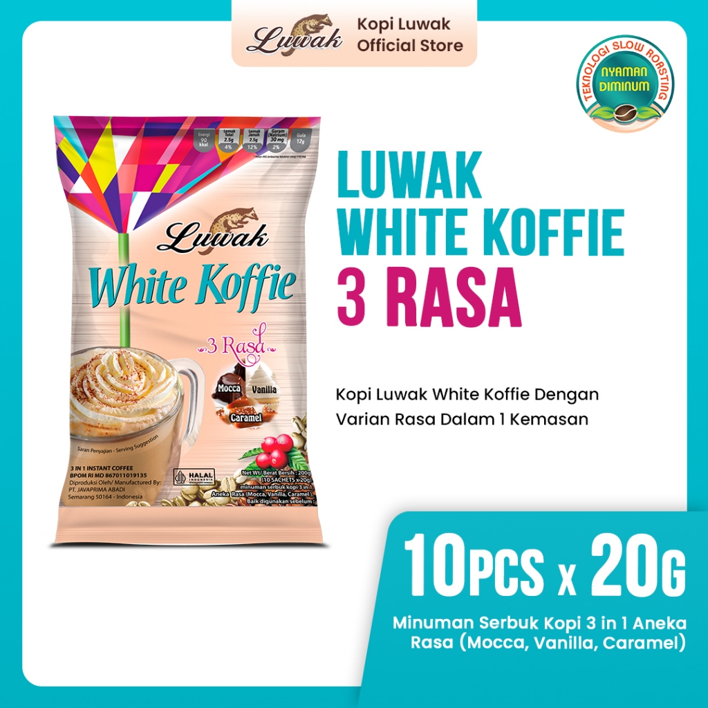 Luwak white koffie 3 rasa memberi warna baru keseharian Anda. Perpaduan dari 3 rasa (moka, vanilla, dan karamel) dalam satu sachet menjadikan Anda seperti di kafe saat minum luwak white koffie. Luwak white koffie kopi nikmat, nyaman diminum.