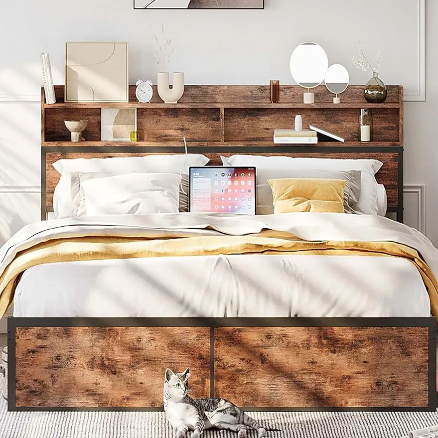 Рама для двуспальной кровати с изголовьем книжного шкафа и зарядной станцией, кровать с металлической платформой, прочная и бесшумная, нет необходимости в коробке