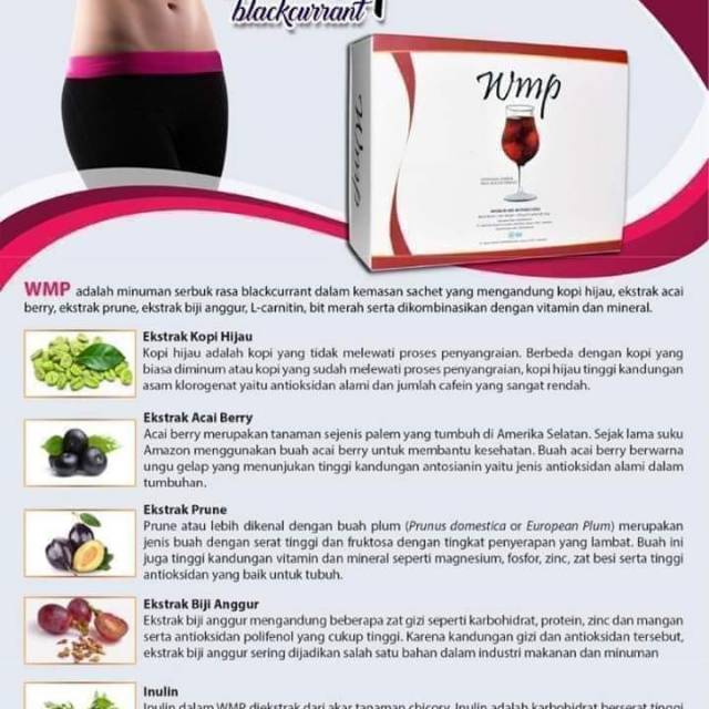 WMP adaLah minuman serbuk yg terbuat dari kopi hijau & beberapa bahan alami Lainya serta dkombinasikan dg vitanin & mineral dgn rasa blackurrant,bekerja sinergis dlm meningkatkan pembakaran Lemak dalam tubuh (metabolisme booster) sehingga penurunan berat badan Lebih efektif.