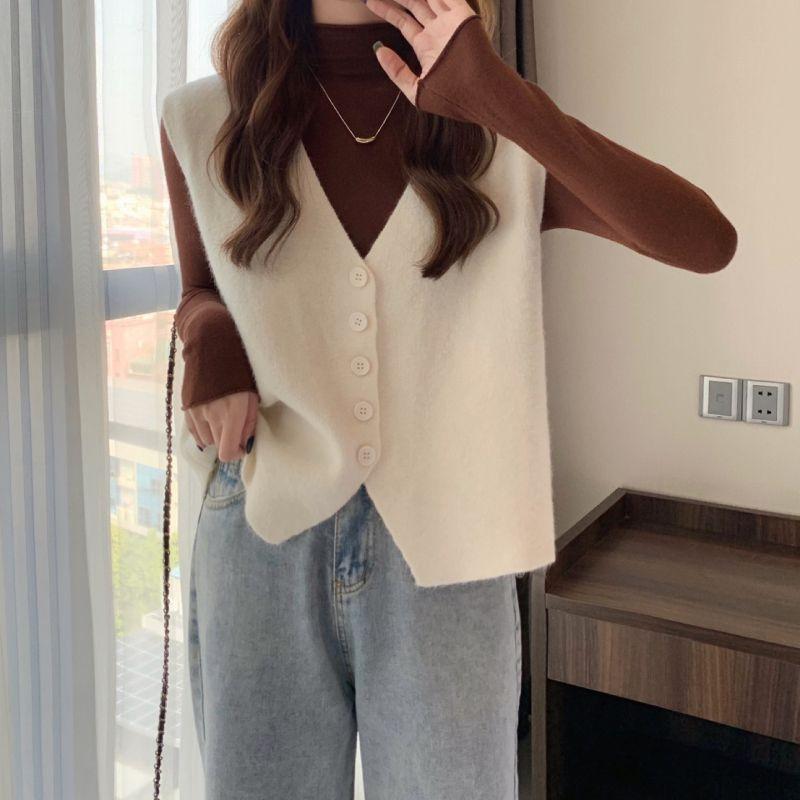 WTEMPO Вязаные жилеты с пуговицами, женские свитера с V-образным вырезом, осень-зима, однотонные, повседневные, без рукавов, трикотажные изделия One Size