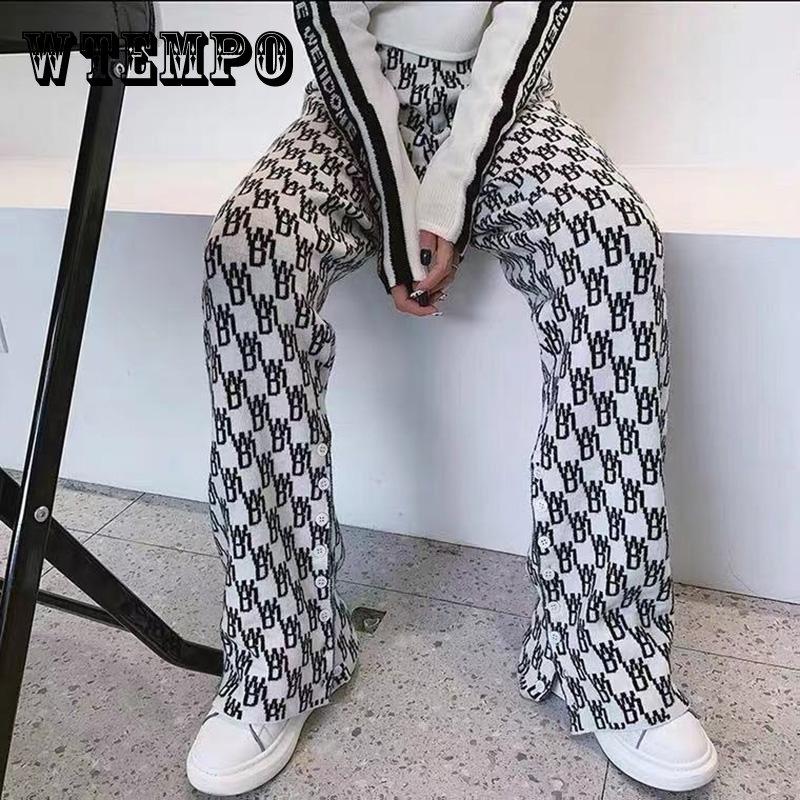 WTEMPO Женские широконогие брюки Черно-белая сетка Гончие Зубые Супер Длинная Средняя талия Прямая Свободная Повседневная Повседневная XXL