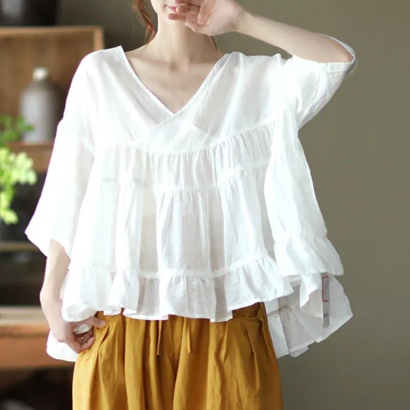 WTEMPO Летние топы из чистого хлопка в стиле ретро, милые лоскутные топы с оборками и высокой талией, женские свободные конопляные рубашки с v-образным вырезом 4XL белый