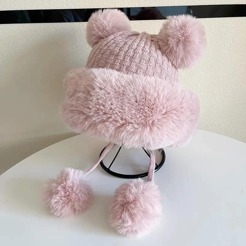WTEMPO Осень-зима вязаные шерстяные шапки искусственный мех кролика шапки-бомберы женские теплые милые защитные шапки для ушей One Size розовый