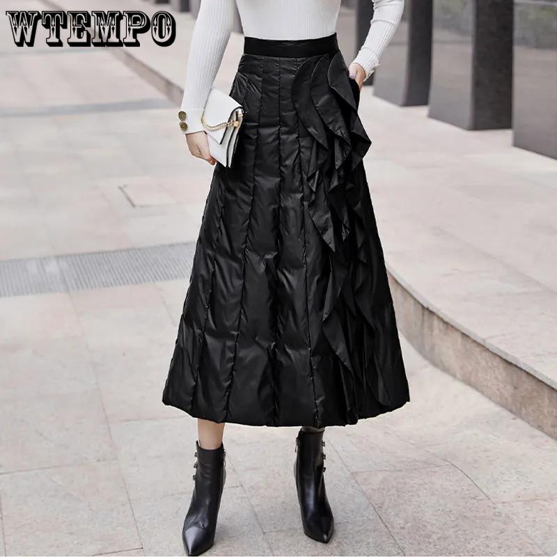 WTEMPO Черная хлопковая юбка на пуху, зимняя женская юбка средней длины, толстая, теплая, ветрозащитная, юбка с неровными оборками и складками