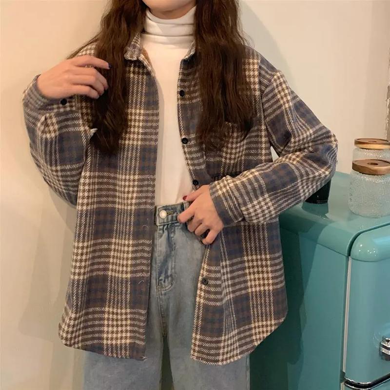 WTEMPO осень-зима утолщенные плюшевые клетчатые рубашки женские винтажные шикарные свободные повседневные теплые рубашки пальто с пуговицами S