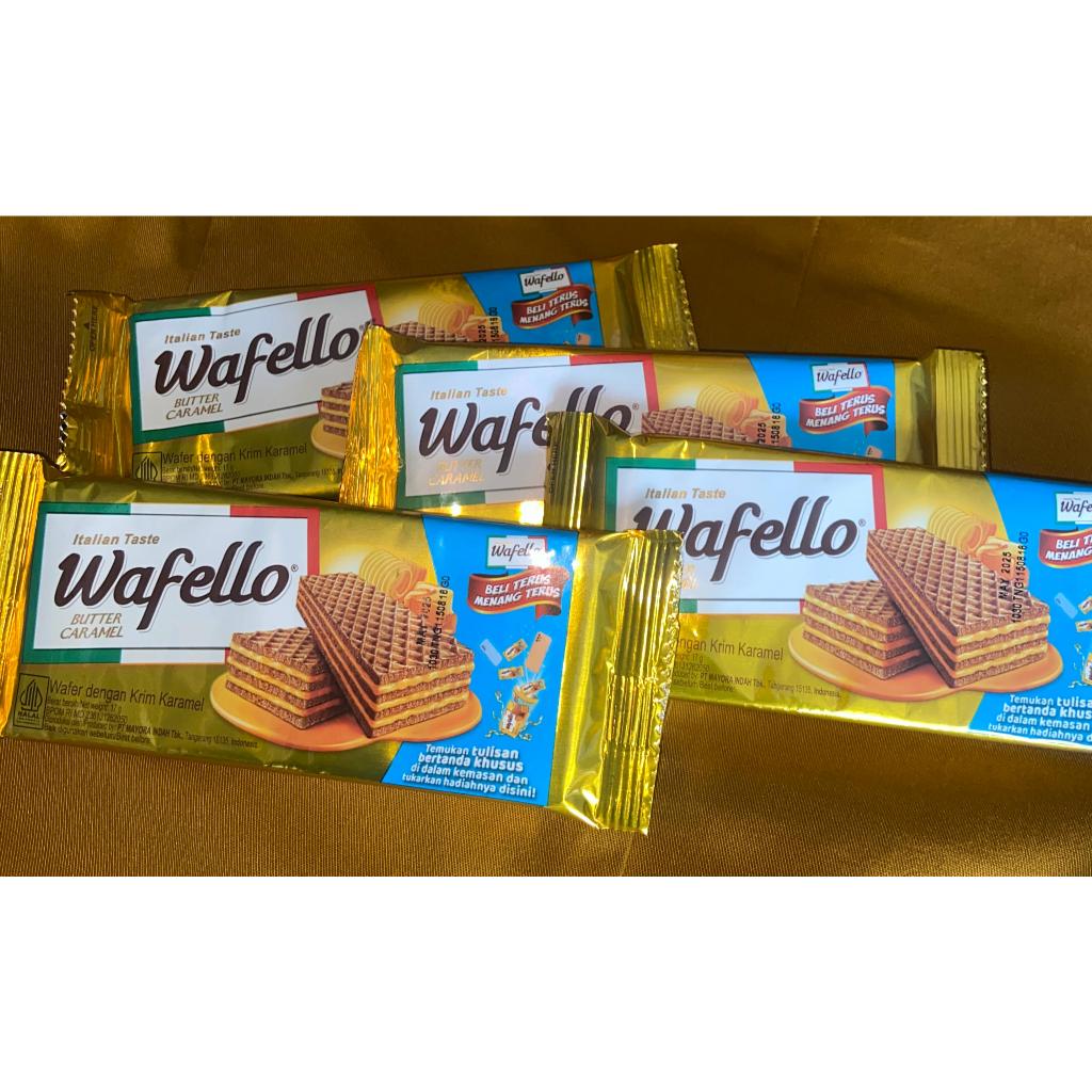 Wafello caramel merupakan makanan ringan yang terdiri dari wafer renyah dan lapisan krim mentega caramel di antara setiap lapisannya. Dari PT Mayora Indah Tbk