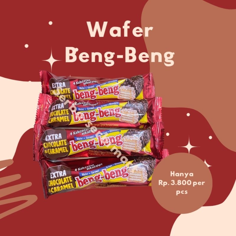 ~ Deskripsi: Beng Beng Wafer Cokelat adalah wafer renyah dengan karamel dan balutan coklat lezat dan tebal di atasnya yang menjadikan wafer ini favorit semua kalangan.