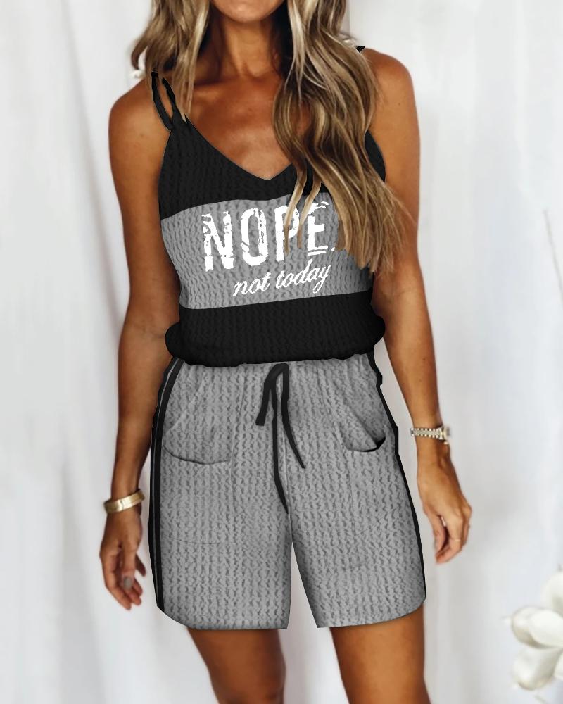 Waffle Knit Letter Print Colorblock Drawstring Romper, Gray