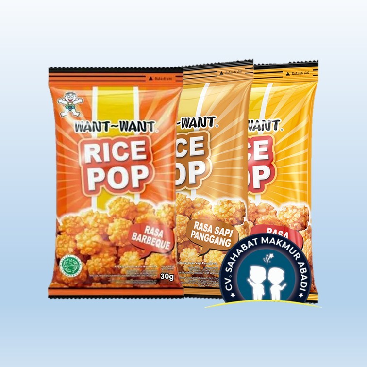 Want Want Ricepop Cemilan 30gr tersedia dalam rasa Original Barbeque Sapi Panggang