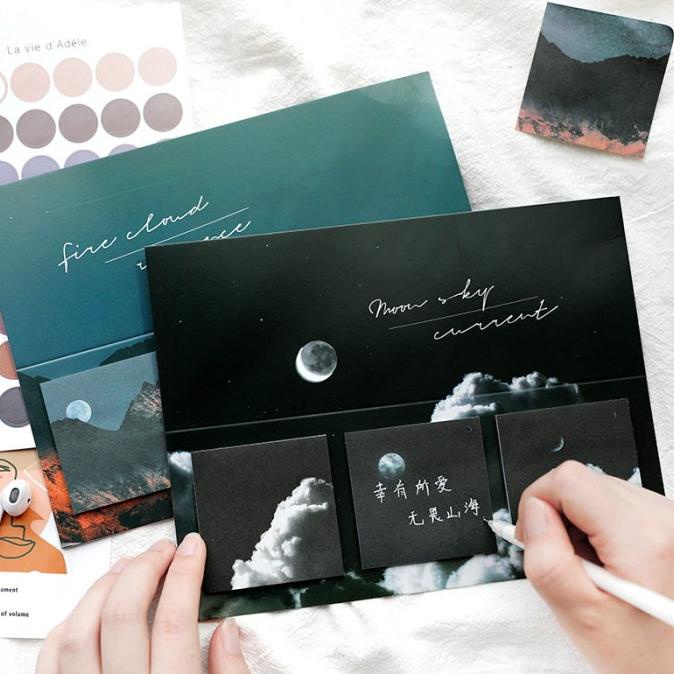 Indahnya pemandangan langit, awan, dan bebungaan menghiasi tiap lembar sticky notes ini. Hadir dalam bentuk brosur yang praktis, tiap varian catatan tempel ini berisi 3 desain berbeda agar kamu tidak bosan menggunakannya.