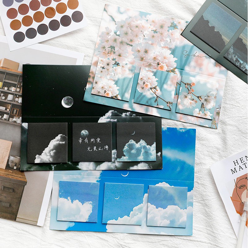 Indahnya pemandangan langit, awan, dan bebungaan menghiasi tiap lembar sticky notes ini. Hadir dalam bentuk brosur yang praktis, tiap varian catatan tempel ini berisi 3 desain berbeda agar kamu tidak bosan menggunakannya.