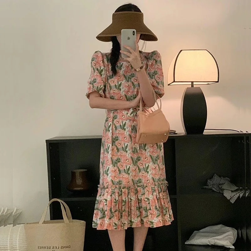 Mid-length O-Neck Lace Up Waist Floral Print Women Dress Korean High Waist Puff Sleeve Ladies Midi Dress Summer Elegant Vestidos