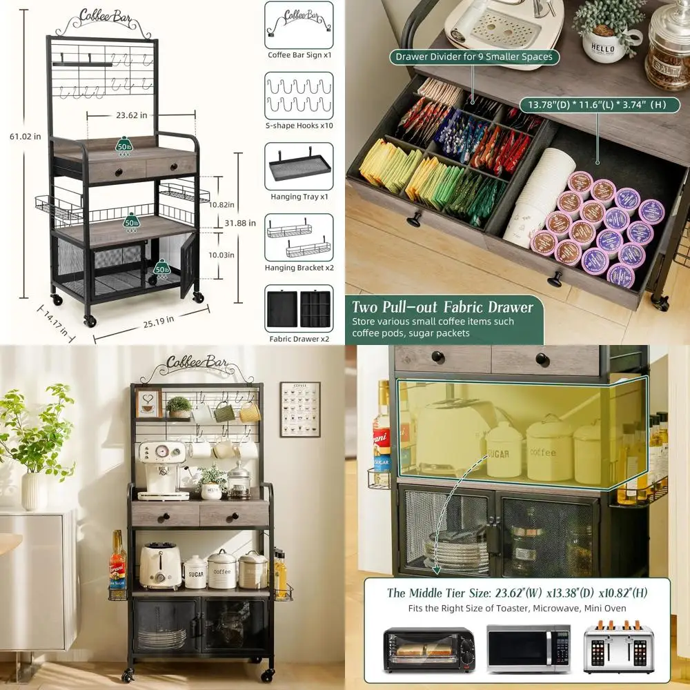 Wheeled Coffee Cart with Storage, Corner Table for Coffee, Rack for Kitchen & Dining