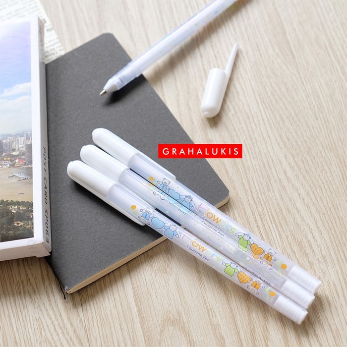 Pena dengan tinta berwarna putih cocok untuk dipakai menulis atau menggambar di kertas warna gelap.