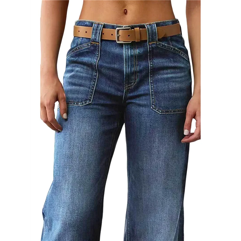 Wide Straight Leg Mid Rise Baggy Pocket Denim Jeans Without Belt