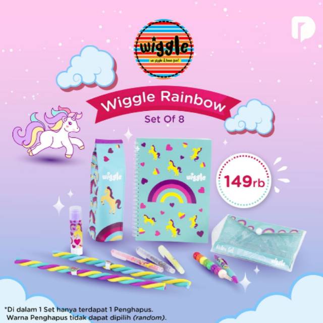 Wiggle Rainbow Set, satu set aat tulis bertema pelangi dari karakter unicorn yang digemari si kecil. Dengan alat tulis yang lebih menarik, menjadikan si kecil lebih semangat untuk beajar dan berkreasi.