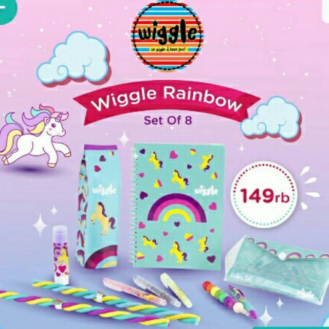 Wiggle Rainbow Set, satu set aat tulis bertema pelangi dari karakter unicorn yang digemari si kecil. Dengan alat tulis yang lebih menarik, menjadikan si kecil lebih semangat untuk beajar dan berkreasi.