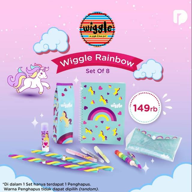 Wiggle Rainbow Set, satu set alat tulis bertema pelangi dari karakter unicorn yang digemari si kecil. Dengan alat tulis yang lebih menarik, menjadikan si kecil lebih semangat untuk beajar dan berkreasi.