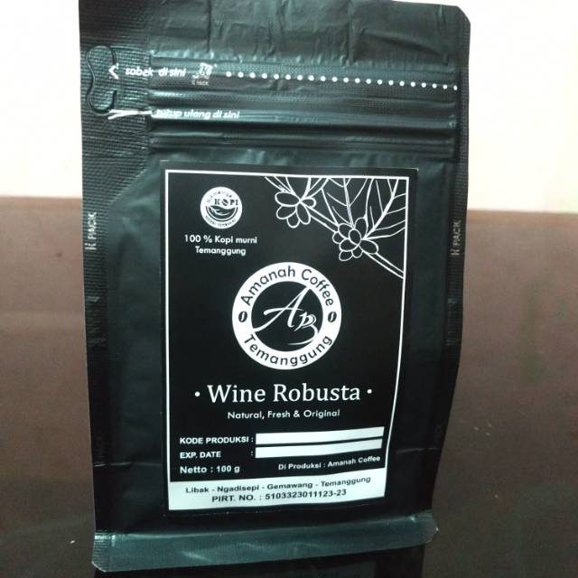 Kopi Bubuk robusta wine diproses Dari biji kopi pilihan petik merah 100%, kopi diproses melalui tahap fermentasi pembekapan murni kopi tanpa bahan campuran sehingga menghasilkan citarasa kopi yg unik