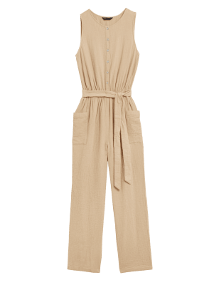 We've crafted this pull-on jumpsuit from double cloth cotton for a durable finish and comfortable feel. It has a regular fit, with a self-tie belt to create a flattering shape. A button-down front and patch pockets on the sides offer a utility-inspired look. We only ever use responsibly sourced cotton for our clothes.n M&S Collection: easy-to-wear wardrobe staples that combine classic and contemporary styles.