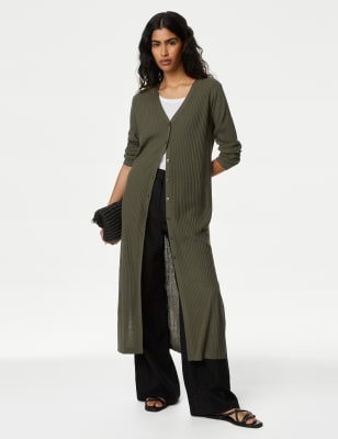 This versatile ribbed cardigan has a touch of linen for a breathable feel. It's made in a longline shape and features a v-neckline, plus a button-through front. Ribbed trims and patch pockets add a neat finish to the piece. n M&S Collection: easy-to-wear wardrobe staples that combine classic and contemporary styles.
