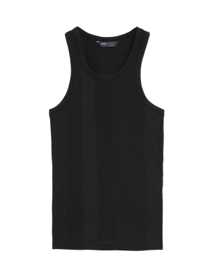 Pull on this ribbed vest top for casual looks. Fitted shape, with added stretch for comfort. Designed with a racer back to offer breathability. M&S Collection: easy-to-wear wardrobe staples that combine classic and contemporary styles.