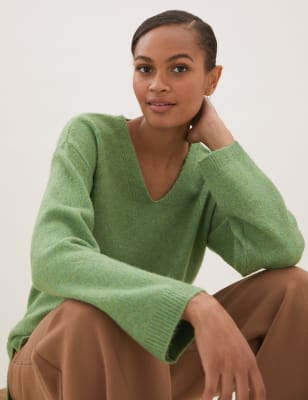 This cosy v-neck jumper makes layering easy. Knitted in a comfy relaxed fit for a laid-back look and a longline length. Ribbing at the neckline and a stepped hem add stylish touches. Made with recycled polyester. M&S Collection: easy-to-wear wardrobe staples that combine classic and contemporary styles.