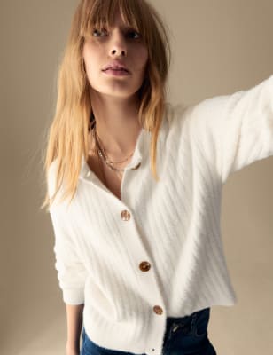 This fluffy cardigan from our Per Una collection is a cosy layer for cooler days. It's designed in a regular fit, with a round neckline and a neat buttoned front. The piece is knitted in a ribbed design for added texture and warmth.n n Per Una: stylish designs crafted with carefully considered details and feminine flourishes.