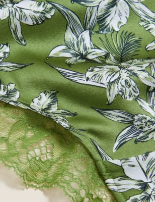 Glossy silk and French-designed lace combine to create these luxurious printed knickers from Rosie Exclusively for M&S. They come in a flattering Brazilian silhouette with a low-rise waist. Added stretch ensures comfortable all-day wear.Exclusively designed signature rose gold hardware adds a refined finishing touch. Rosie: contemporary, feminine silhouettes crafted from luxurious fabrics with intricate detailing.