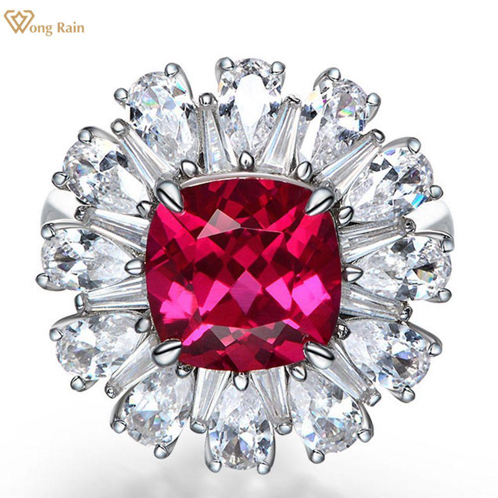 Wong Rain Роскошное кольцо из 100% стерлингового серебра 925 пробы 9*9 мм AAAAA с цирконами, драгоценный камень, юбилейное вечерние кольцо для женщин, изящные ювелирные изделия, подарок US 5 красный