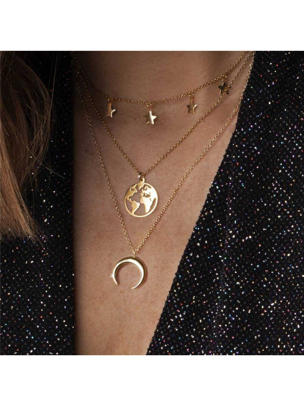 accessories,world map moon crescent alloy pendant multi-layer combination necklace