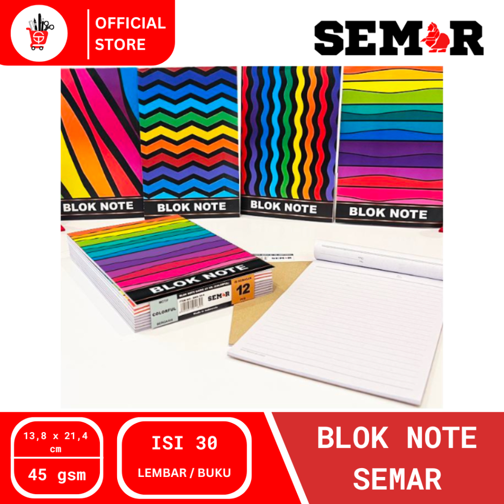 BLOK NOTE SEMAR 30L (1 PCS) SPESIFIKASI : - Ukuran : 13,8 x 21,4 cm - Isi : 30 Lembar - Ketebalan : 45 gsm - Gambar : Colorful - Harga per PCS >>> NOTE