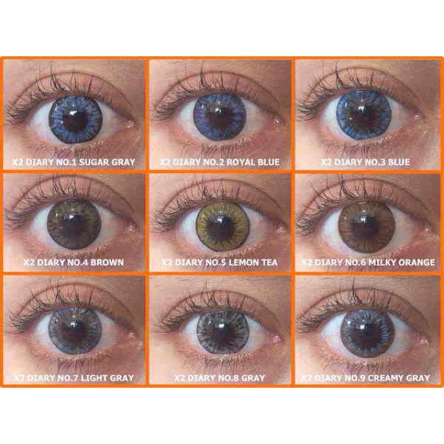 X2 DIARY (Angels), 14.50mm untuk maksimal 12 bulan, SUPER NYAMAN, mempunyai 9 warna pilihan: (1.Sugar Grey),(2.Royal Blue),(3.Blue),(4.Brown),(5.Lemon Tea),(6.Milky Orange),(7.Light Grey),(8.Grey),(9.Creamy Grey). Tersedia ukuran normal s/d -6,00 (mulai -4,00, stepnya -0,50). Warnanya soft dan natural, terutama No.1 dan No.9. Semua FREE LENSCASE